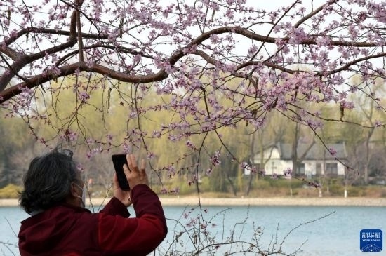 3月8日,一名游客在北京玉淵潭公園拍攝盛開的山桃花。