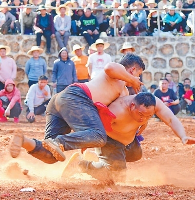 紅河哈尼族彝族自治州彌勒市西三鎮(zhèn)正在舉行彝族傳統(tǒng)摔跤比賽活動(dòng)。普佳勇攝(人民視覺(jué))