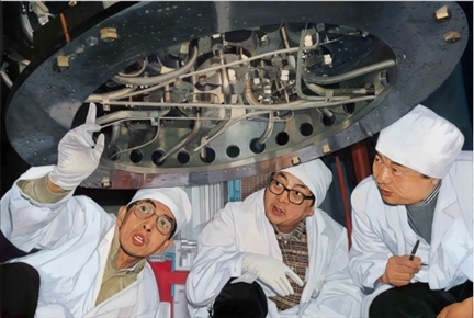 布面油畫《知難而進 眾志成城》原型為新華社記者王呈選拍攝的一幅新聞?wù)掌?,畫面?0世紀(jì)80年代末清華大學(xué)核能與新能源技術(shù)研究院王大中、馬昌文、董鐸正在進行5兆瓦低溫核反應(yīng)堆調(diào)試的場景。作品生動地刻畫了以國家最高科學(xué)技術(shù)獎獲得者王大中院士等為代表的清華教師勇于承擔(dān)國家重大科技項目,知難而進、眾志成城的寶貴精神。