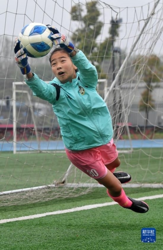 在瀘州天立春雨學(xué)校足球場,來自涼山彝族自治州的拉普么拉扎在進行守門員訓(xùn)練(3月29日攝)。