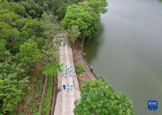 在海南瓊中縣舉辦的中國足協(xié)女足青訓(xùn)中心“希望杯”U12組比賽的空閑時段,四川隊隊員在賓館內(nèi)部道路跑步(無人機照片,4月10日攝)。