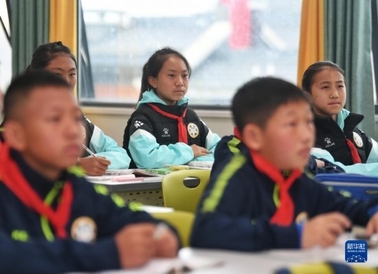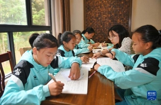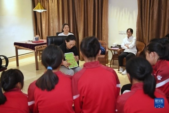在海南瓊中縣舉辦的中國足協(xié)女足青訓(xùn)中心“希望杯”U12組比賽的空閑時段,來自涼山彝族自治州的四川隊隊員舍布么扯鳩莫(左二)和隊友們在老師帶領(lǐng)下學(xué)習(xí)文化課(4月10日攝)。