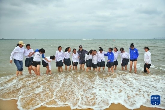 在海南瓊中縣舉辦的中國足協(xié)女足青訓(xùn)中心“希望杯”U12組比賽結(jié)束后,四川隊教練團隊帶領(lǐng)隊員在海邊游玩(4月11日攝)。