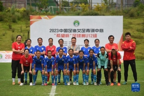在海南瓊中縣舉辦的中國足協(xié)女足青訓(xùn)中心“希望杯”U12組四川隊對陣廣東隊的比賽后,四川隊成員在球場合影(4月10日攝)。
