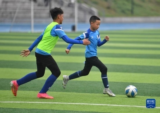 在瀘州天立春雨學(xué)校足球場,來自涼山彝族自治州的金貴坤(右)與隊友進行訓(xùn)練(3月28日攝)。
