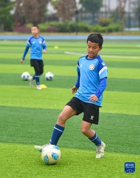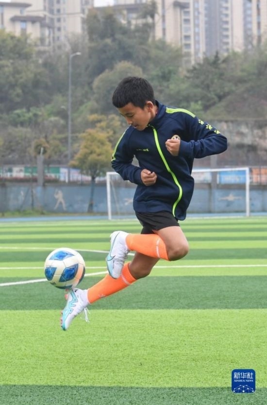 在瀘州天立春雨學(xué)校足球場,來自涼山彝族自治州的楊坤在進行訓(xùn)練(3月28日攝)。