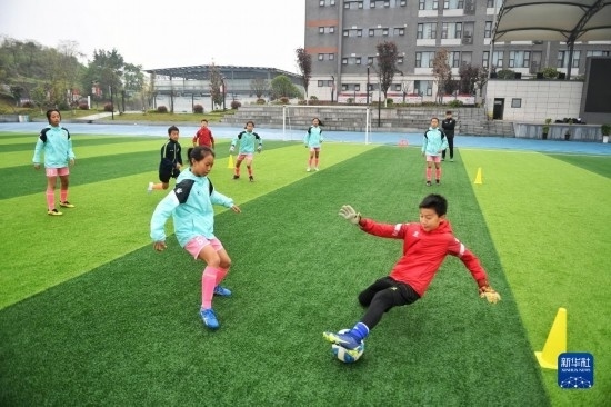 在瀘州天立春雨學(xué)校足球場,來自涼山彝族自治州的舍布么扯鳩莫(前左)與男隊一起訓(xùn)練(3月29日攝)。