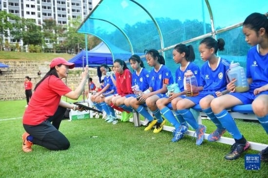 在海南瓊中縣舉辦的中國足協(xié)女足青訓(xùn)中心“希望杯”U12組比賽的空閑時段,四川隊主教練陳華(中)為隊員進行戰(zhàn)術(shù)指導(dǎo)(4月9日攝)。