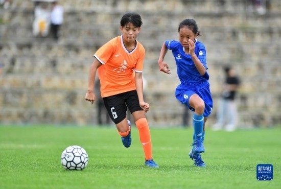 在海南瓊中縣舉辦的中國足協(xié)女足青訓(xùn)中心“希望杯”U12組四川隊對陣廣東隊的比賽中,來自涼山彝族自治州的四川隊球員舍布么扯鳩莫(右)奮力拼搶(4月10日攝)。
