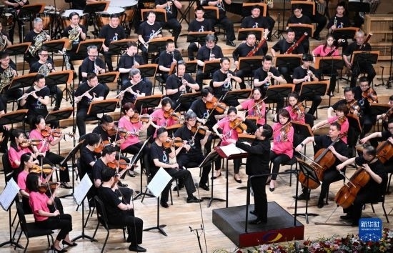 5月25日,在天津大劇院音樂(lè)廳,由天津歌舞劇院、天津交響樂(lè)團(tuán)等組成的天津百人聯(lián)合樂(lè)團(tuán)在舞臺(tái)上演奏。