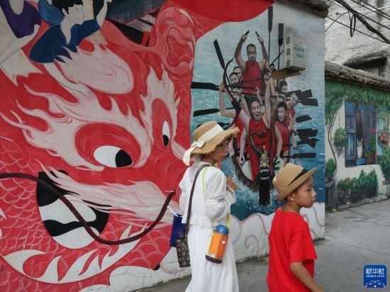 6月22日,游人經(jīng)過(guò)佛山疊滘東勝村一面龍船彩繪墻壁。