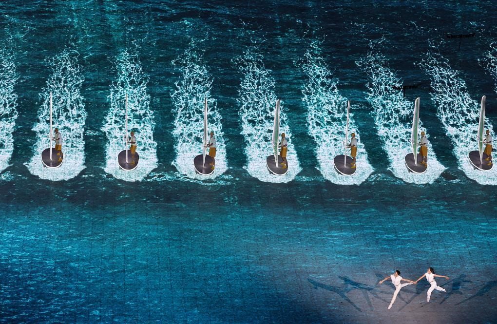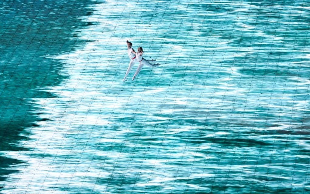 本屆亞運(yùn)會首次將3D雙威亞技術(shù)應(yīng)用于大型運(yùn)動場中。立體飛旋于空中的男女演員與潮共舞,吊著威亞的他們在空中完成了各種高難度動作,并與地屏中的浪潮實時互動,踏浪而行,成就了科技與藝術(shù)完美融合。