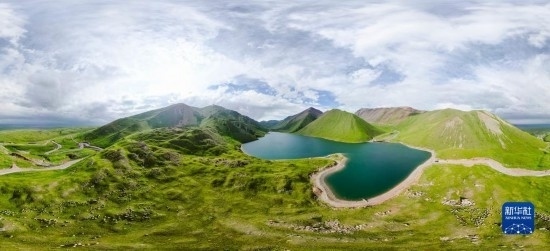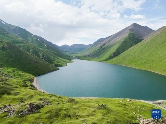 這是和靜縣一處高山湖泊景觀(7月5日攝,無(wú)人機(jī)全景照片)。