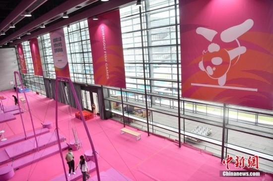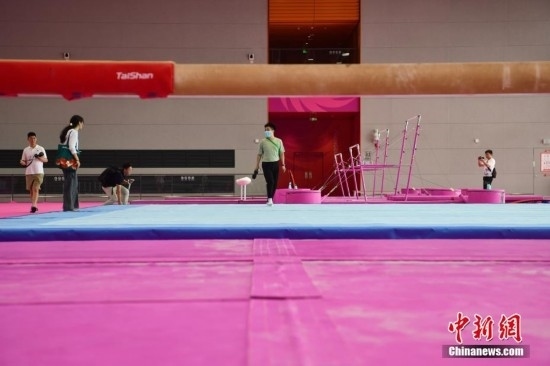 7月14日,成都東安湖體育公園內(nèi),成都大運(yùn)會(huì)體操比賽訓(xùn)練場(chǎng)的粉色布置吸引媒體記者探訪。海綿墊、平衡木、吊環(huán)、鞍馬等設(shè)施均為粉色,充滿青春活力,令人倍感放松。目之所及,海綿墊、平衡木、吊環(huán)、鞍馬等設(shè)施均為粉色。