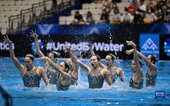 7月21日,中國隊在比賽中。當(dāng)日,在日本福岡舉行2023年世界游泳錦標(biāo)賽花樣游泳集體自由自選決賽中,中國隊以329.1687分的成績獲得冠軍。新華社記者 夏一方 攝