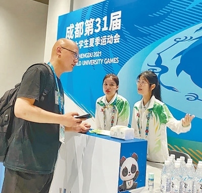 志愿者為媒體工作者提供幫助。本報記者 蔣雨師攝