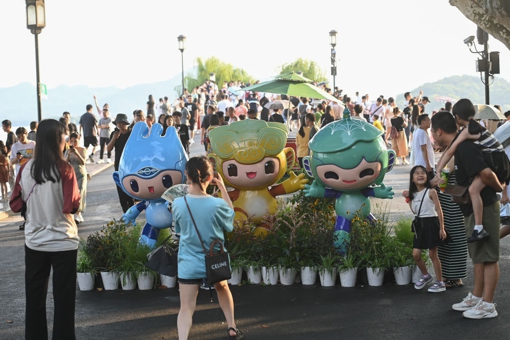游客在位于杭州西湖景區(qū)的斷橋邊與杭州亞運(yùn)會吉祥物合影(2023年8月21日攝)。新華社記者 黃宗治 攝