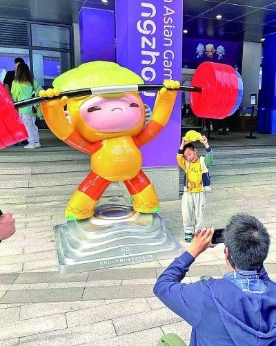 10月5日,亞運(yùn)會舉重場館外,觀眾爭相與吉祥物合影,一位小朋友特意擺出與吉祥物“琮琮”一樣的舉重姿勢合影留念。本報(bào)記者 楊震攝/光明圖片