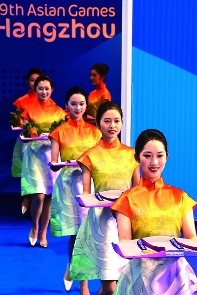 9月30日,亞運(yùn)會跳水項(xiàng)目頒獎(jiǎng)儀式上,禮儀人員手托裝有獎(jiǎng)牌的托盤,面帶笑容走向頒獎(jiǎng)臺。本報(bào)記者 楊震攝/光明圖片