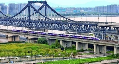 10月3日,亞運(yùn)涂裝復(fù)興號智能動(dòng)車組從杭州東站發(fā)出,穿過錢塘江。本報(bào)記者 陳城攝/光明圖片