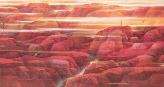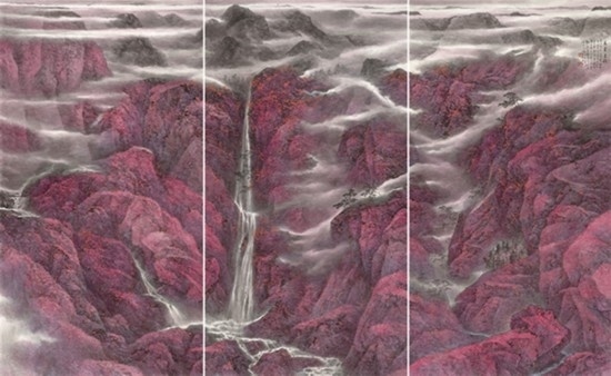 來自上海并深受海派畫學(xué)影響的樂震文、張弛,在宋元及明清山水畫學(xué)上打下了深厚的功底,也因此,他們的傳統(tǒng)山水畫深受日本民眾的歡迎。他們曾游居?xùn)|瀛多年,轉(zhuǎn)道再度研習(xí)了中國傳統(tǒng)文人畫。但真正改變他們畫風(fēng)的,卻是他們對中國北方大山大水的寫生攬勝。他們鐘情于英雄的太行山,忘情于革命勝地陜北高原,力求通過壯闊雄渾的山巒、連綿逶迤的群峰來表達(dá)他們的時(shí)代感悟,營構(gòu)儲存于他們胸中的山川氣象。所謂“山河回聲”,正是這些作品抒發(fā)的中華民族歷經(jīng)歲月風(fēng)華在大好河山之中回響的奮斗激情。