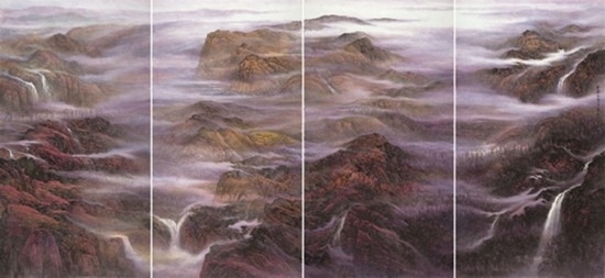且看樂震文的《直上浮云》《云卷云舒》和《黃土馳風(fēng),日月星辰》,那逶迤茫茫的群山峻嶺,那縱橫畫面的云蒸霞蔚,那連綿不絕的箭樓城堞,哪里還是傳統(tǒng)文人山水畫的淡煙輕嵐,縹緲冷逸?濃縮于畫內(nèi)的精神意蘊(yùn),分明凸顯了現(xiàn)代山水畫對家國情懷的抒發(fā)。且讀張弛的《云起疊嶂》《惟余莽莽》和《紫氣氤氳》,那天光紫氣的浩渺煙云,那渾然一體的山水氣象,那千回百轉(zhuǎn)的流水飛泉,其實(shí)早已脫離了對自然山水的寫照,而是她感悟的時(shí)代精神在偌大畫面上的縱橫揮寫、主觀臆造。