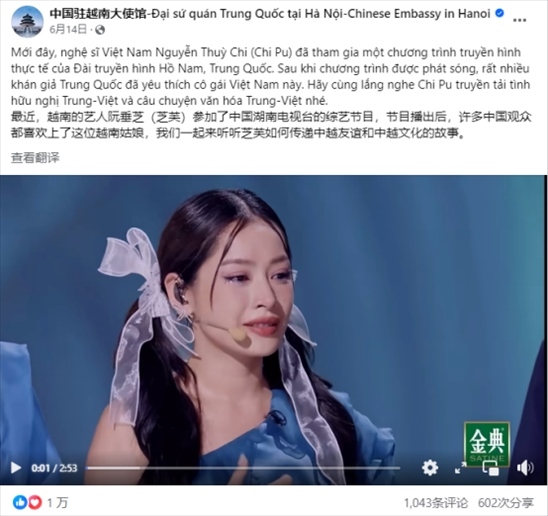 中國駐越南大使館Facebook發(fā)文點(diǎn)贊越南藝人芝芙在《乘風(fēng)2023》傳播中越文化。