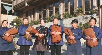 非物質(zhì)文化遺產(chǎn)傳承、文化產(chǎn)品開(kāi)發(fā),使鄉(xiāng)村文化在鄉(xiāng)村振興建設(shè)中發(fā)揮更大作用,也讓鄉(xiāng)村文化遺產(chǎn)更好地留存下來(lái)、傳承下去。非遺傳承人楊成蘭(左三)與織娘一起展示手作侗布。受訪者供圖本文圖片除署名外均由朱玉芳攝