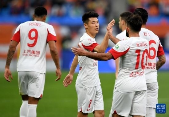 5月1日,上海海港隊球員古斯塔沃(中)在比賽中與隊友慶祝進(jìn)球。