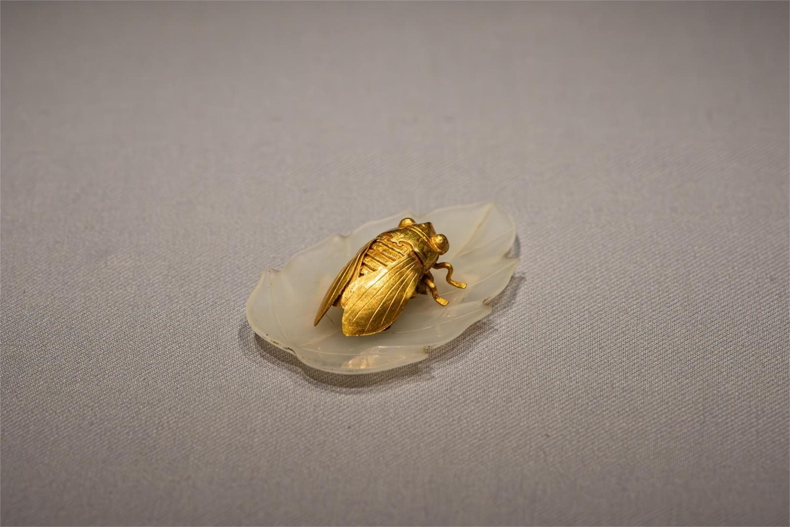 金蟬玉葉是南京博物院的鎮(zhèn)院之寶之一,是500年前貴族女子發(fā)髻上的一件時尚單品。在《玉潤中華——中國玉器的萬年史詩圖卷》大展上,它也是“網(wǎng)紅文物”之一。形神畢肖、金光閃耀的蟬棲憩在玉葉上,它嘴巴微張好似在奏鳴,玉葉葉脈分明,細(xì)薄呈凹弧狀,經(jīng)鑒定金蟬含金量達到95%,而蟬翼厚度僅為0.2毫米,工藝精致且繁復(fù)。