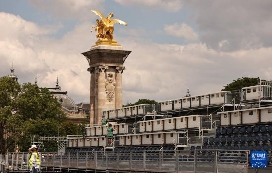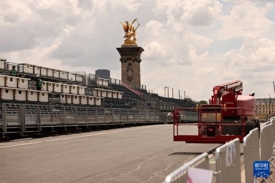 這是6月4日在位于法國(guó)巴黎市中心的亞歷山大三世橋拍攝的臨時(shí)比賽場(chǎng)地搭建現(xiàn)場(chǎng)。這里將是巴黎奧運(yùn)會(huì)多個(gè)比賽項(xiàng)目的終點(diǎn),包括公路自行車(chē)個(gè)人計(jì)時(shí)賽、游泳馬拉松、鐵人三項(xiàng)比賽。新華社記者 高靜 攝