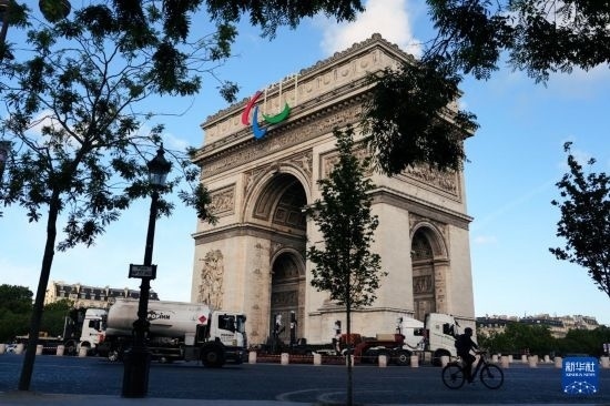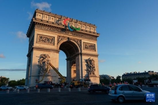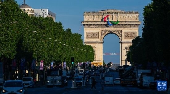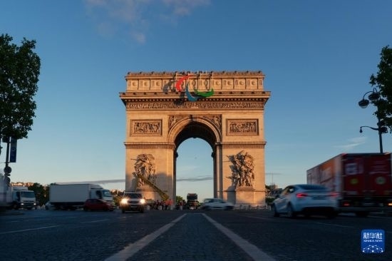 這是6月28日在法國(guó)巴黎拍攝的懸掛有殘奧會(huì)標(biāo)志的凱旋門(mén)。新華社記者 許暢 攝