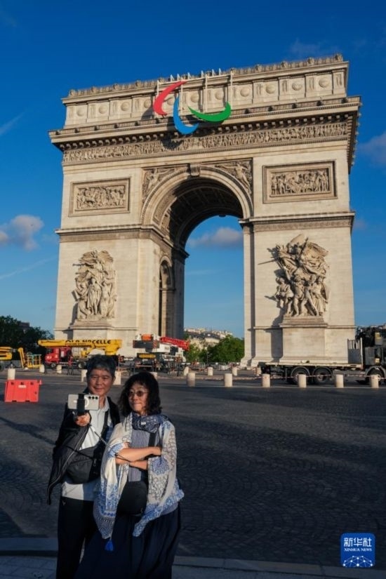 6月28日,游客在懸掛有殘奧會(huì)標(biāo)志的法國(guó)巴黎凱旋門(mén)附近拍照留念。新華社記者 許暢 攝