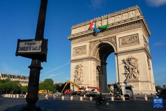 6月28日,施工人員在法國(guó)巴黎凱旋門(mén)懸掛殘奧會(huì)標(biāo)志。新華社記者 許暢 攝