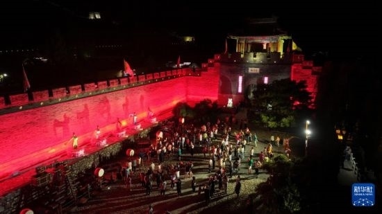 8月21日,游客在觀看“大明邊塞”之夜游黃崖關(guān)系列演出(無(wú)人機(jī)照片)。
