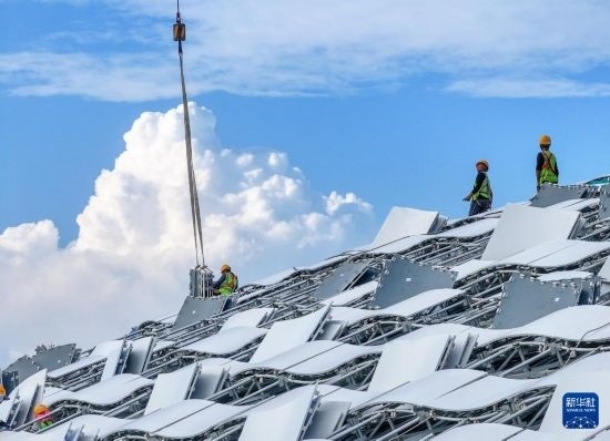 10月16日,中建深裝施工人員在深圳市體育中心專業(yè)足球場(chǎng)屋頂?shù)跹b幕墻材料(無(wú)人機(jī)照片)。