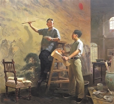 正在舉辦的第十四屆全國美術(shù)作品展覽進京作品展上,撲面而來的藝術(shù)形象是腳踏中華大地的各族人民,是中國近現(xiàn)代文化史上的先賢圣哲,是和我們一道相擁而立的堂堂中國人。這些形象剛強勇毅,如潮如云,傳遞著眾志成城的精神力量,扣動人心。譬如,呂鵬《山河頌》,以濃郁的色調(diào),再現(xiàn)傅抱石、關(guān)山月兩位前輩創(chuàng)作《江山如此多嬌》的情景,鐫刻新中國美術(shù)史上重要一幕;鄔大勇《我心中的英雄》塑造了畫家少年時代的英雄偶像——錢學(xué)森等一代科學(xué)家。還有許多氣勢宏大的創(chuàng)作,它們既是社會生活、時代精神的藝術(shù)載體,又是美術(shù)工作者面對歷史、面對人民的激情熔爐。這些作品以人民形象為根基,深植時代沃土,構(gòu)成歷史與現(xiàn)實相輝映的史詩畫卷。