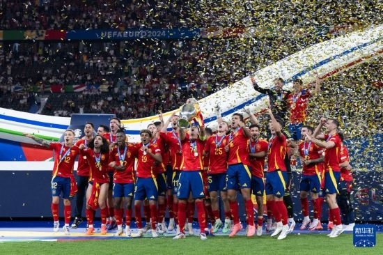 這是2024年7月14日,西班牙隊(duì)在2024歐洲足球錦標(biāo)賽決賽后的頒獎(jiǎng)儀式上慶祝。新華社記者 肖藝九 攝