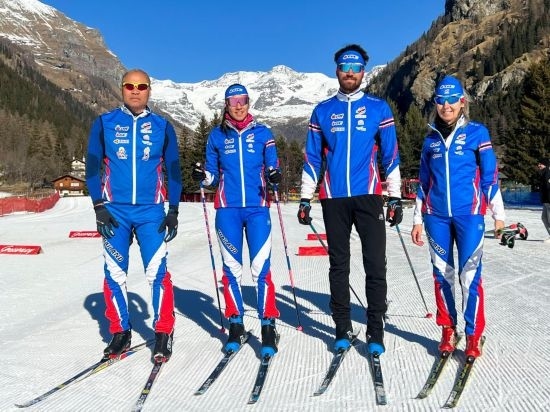 2022年1月24日,泰國(guó)越野滑雪隊(duì)運(yùn)動(dòng)員卡倫·尚隆(左二)、馬克·尚?。ㄗ笕┡c父母在歐洲備戰(zhàn)訓(xùn)練時(shí)合影。新華社發(fā)(受訪者供圖)