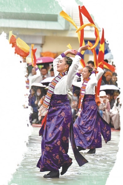 春節(jié)假期,每到傍晚時分,四川省阿壩藏族羌族自治州若爾蓋縣城中心的北上廣場都會準(zhǔn)時響起歡快的鍋莊曲,遠道而來的游客與當(dāng)?shù)厝罕娨黄鹛饸g快的鍋莊。伴著音樂,鮮艷的長袖在風(fēng)中劃出道道弧線,腰飾隨著舞步搖曳,男女老少圍成一圈、翩然起舞。