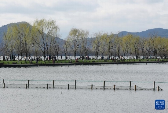 3月4日,游客行走在杭州西湖白堤上。