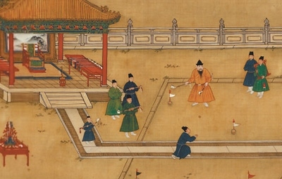 捶者,打也;丸者,球也?!安簧賹W(xué)生剛接觸捶丸時(shí),說它像現(xiàn)代的高爾夫。其實(shí),捶丸比高爾夫運(yùn)動(dòng)歷史更悠久?!逼巾斏綄W(xué)院陶瓷學(xué)院院長梅國建介紹,捶丸源自唐代擊鞠(馬球)和步打球,傳至宋朝逐漸演變?yōu)橐来螕羟虻姆菍剐员荣?,名稱也變?yōu)榇吠?,現(xiàn)藏于故宮博物院的《明宣宗行樂圖》中就描繪了宮中捶丸的場景。