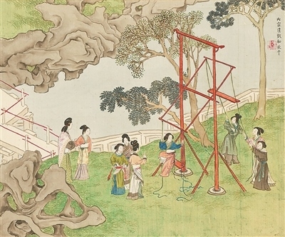 秋千,古稱“千秋”,可追溯至春秋時(shí)期,后改為“秋千”。據(jù)《荊楚歲時(shí)記》記載:“春時(shí)懸長繩于高木,士女衣彩服坐于其上而推引之,名曰打秋千。”在古代,清明節(jié)更是有著秋千節(jié)的別稱,可見古人對春日蕩秋千的喜愛。
