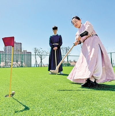 瞄球、揮擊,隨著一聲清脆的擊打聲,陶瓷小球劃出優(yōu)美的弧線,停到插有旗桿的“球窩”附近。春日遲遲,在河南省平頂山學(xué)院捶丸球場,一群學(xué)生身著漢服或運(yùn)動(dòng)服飾,借助形狀各異、長短不一的球杖,對草坪上的陶瓷球進(jìn)行輪番擊打。
