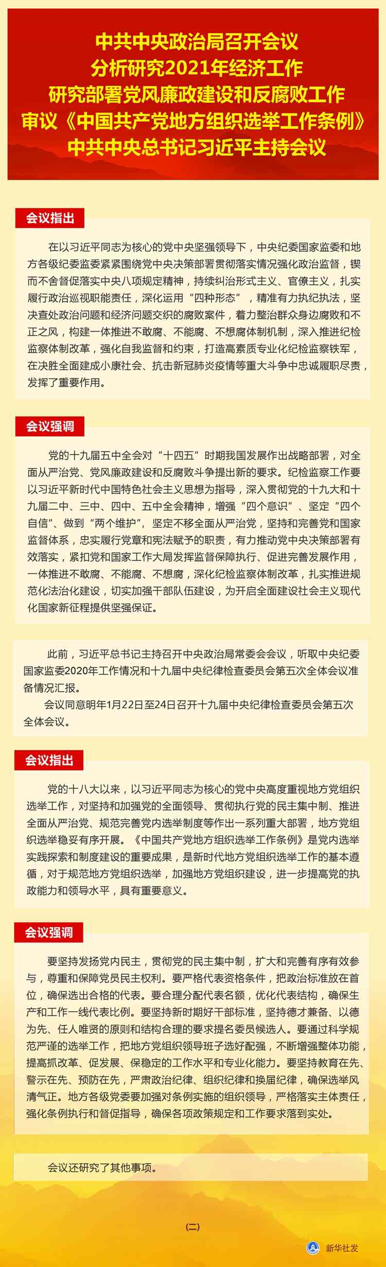 新華社北京12月11日電 中共中央政治局12月11日召開會議,分析研究2021年經(jīng)濟工作;聽取中央紀委國家監(jiān)委工作匯報,研究部署2021年黨風(fēng)廉政建設(shè)和反腐敗工作;審議《中國共產(chǎn)黨地方組織選舉工作條例》。中共中央總書記習(xí)近平主持會議。