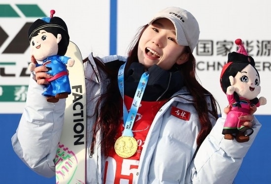劉夢婷的雪板上有一個(gè)“谷”字,她解釋說這是谷愛凌同款定制雪板?!拔液芟矚g她的風(fēng)格,把她作為我的榜樣,激勵我進(jìn)步。”