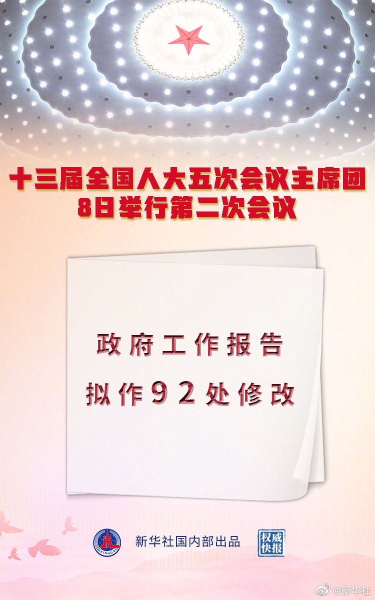 記者8日從十三屆全國人大五次會(huì)議主席團(tuán)第二次會(huì)議上獲悉,政府工作報(bào)告擬作92處修改?! ?br/>