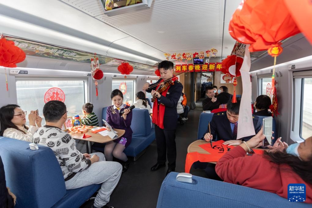 ??2月9日,在鐵路上海客運(yùn)段G1426次列車舉行的“列車春晚迎新年”主題活動(dòng)上,乘務(wù)員為旅客演奏小提琴。