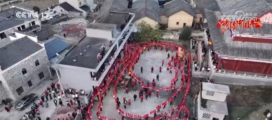板凳龍是湖北咸寧江源村的特色文化活動(dòng),由175節(jié)板凳組成的369米“火龍”在村中巡游,家家戶戶燃放鞭炮接龍祈福。在一波波鼓樂聲中,村民用白酒灑向龍頭、龍尾,道出新年寄語。