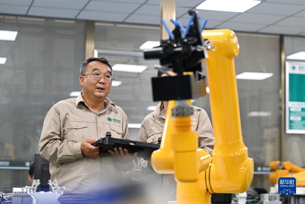 張黎明(左)和同事在調試第四代配網帶電作業(yè)機器人(2022年9月8日攝)。新華社記者 趙子碩 攝